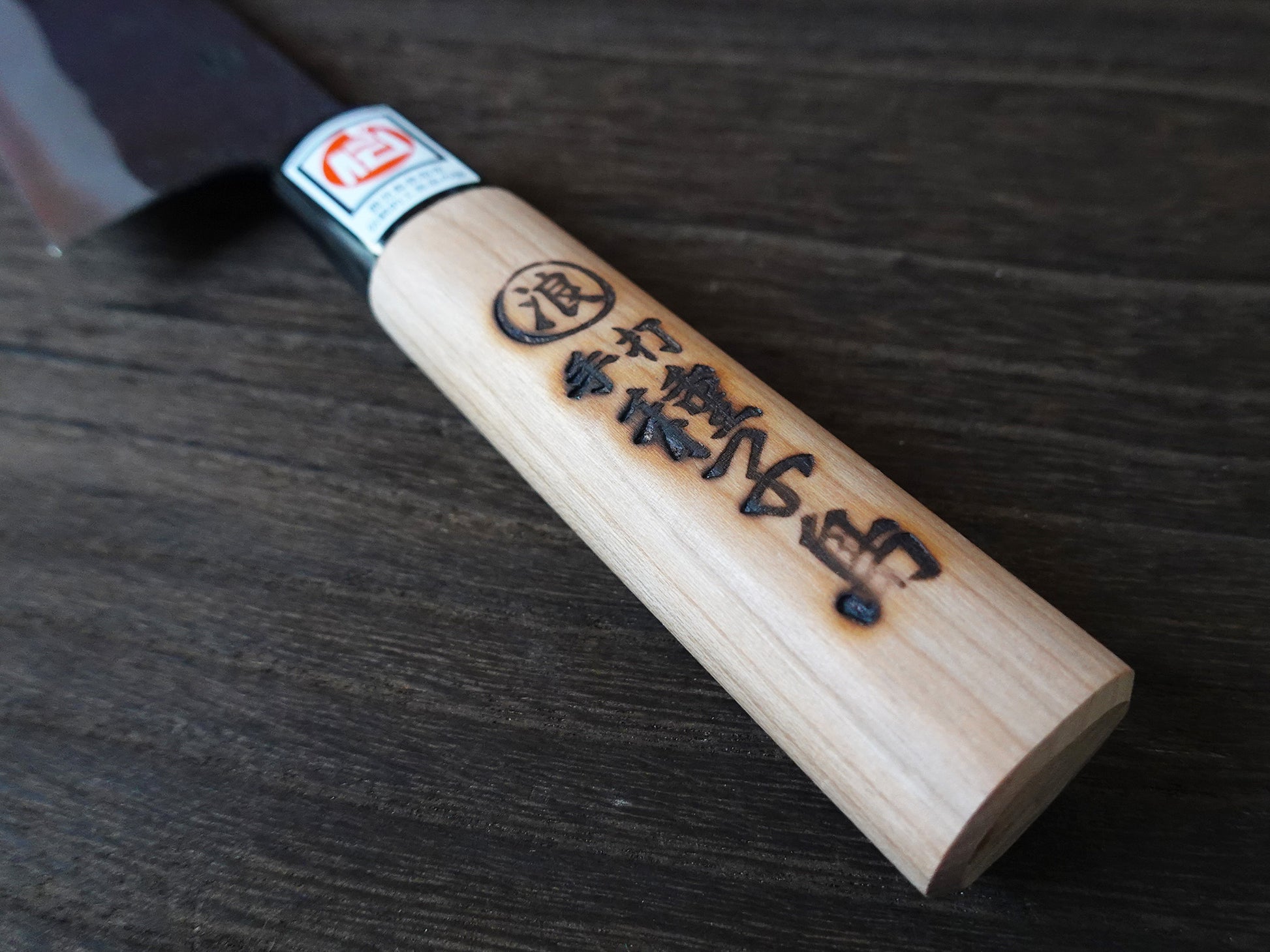 Este es un cuchillo Santoku Kurouchi (acabado negro) hecho de acero Shirogami. El Shirogami es un acero al carbono, no inoxidable, por lo que se oxida, pero es fácil de afilar y tiene una excelente capacidad de corte. Su aspecto rústico también le confiere encanto. Recomendado para quienes tengan una piedra de afilar.